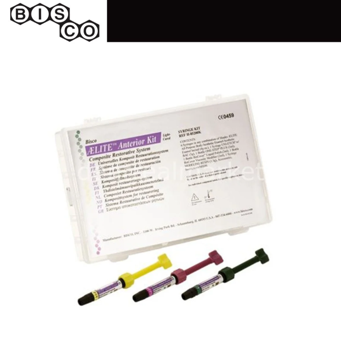 Aelite Aesthetic Enamel (4g ea.) Shades: A1, A2, C2, 1 Shade, 1 Syringe Aelite Aesthetic Enamel Incisal (4g) Shade: CLEAR, 1 Syringe Uni-Etch® w/BAC (5g), 1 Bottle One-Step® Plus (2ml), 1 Bottle BisCover™ LV (0.5ml), 1 Syringe Modeling Resin (1.5g), Accessories, Instructions